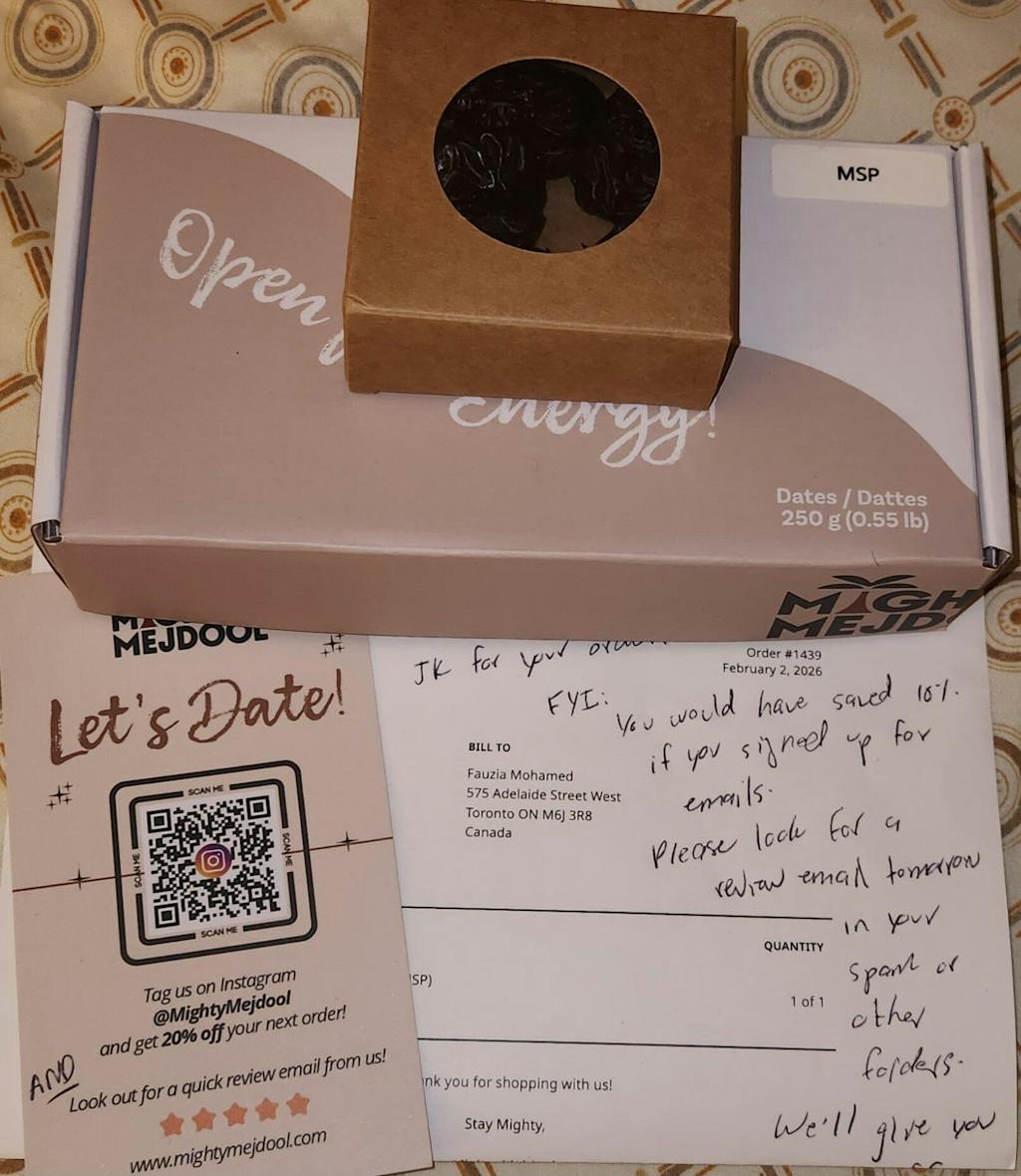 "I am 100% satisfied with my first order from Mighty Medjool! My order arrived promptly even with the recent snow storms. I was pleasantly surprised to receive free samples of two premium dates, Ajwa and Safawi, along with a generous 20% discount got my next order. What truly stood out was the handwritten note thanking me for my order; it is rare to see this level of care and personal touch. Excellent quality and even better service—highly recommended! With ramadhan almost upon us, this is an amazing gift to give our loved ones. May Allah grant you great success in your business... Ameen!"